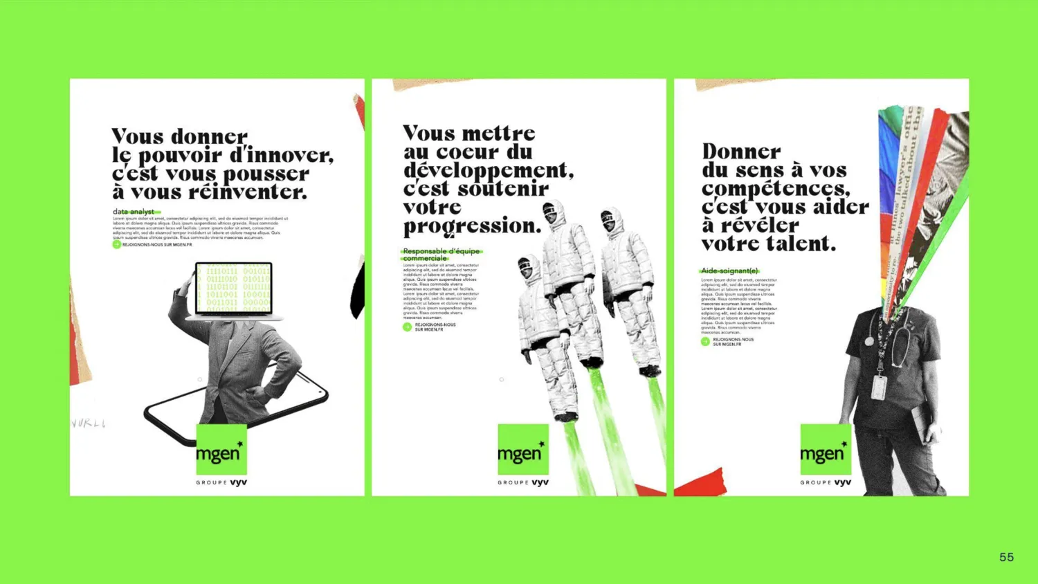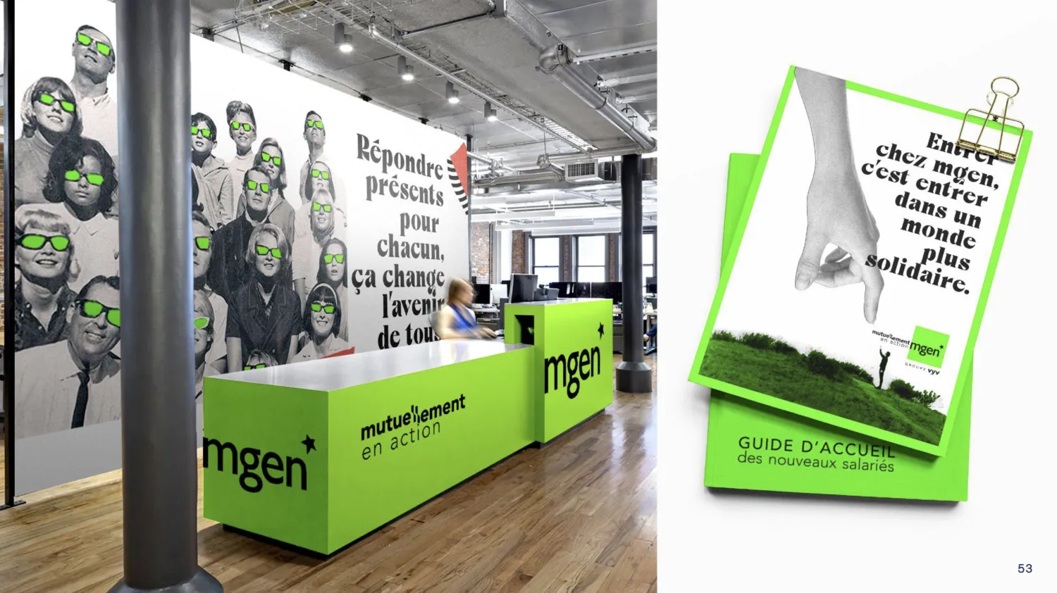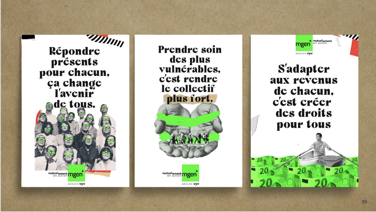 Un territoire qui remonte aux sources militantes de la MGEN et qui vient bousculer les codes du marché avec son vert fluo et ses découpages poétiques et azimutés.